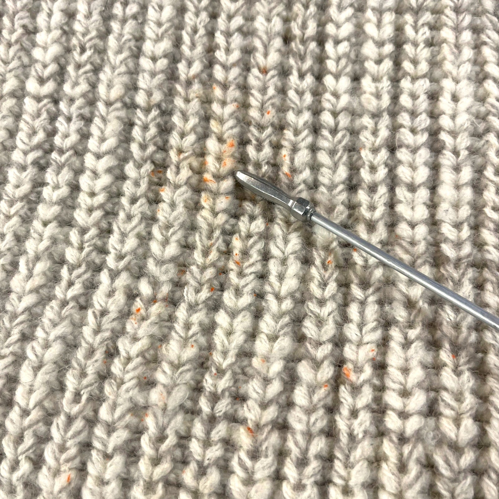 Very good used vintage condition overall. No holes or tears. Please note: Front bottom of garment, there are a few small orange surface specks visible in one close-up photo. These appear to be dry, crusty paint flecks sitting on the surface of the yarn, not dye stains or color bleed. Some were carefully removed, but I chose not to remove all to avoid risking snags or pulling the wool fibers. See close-up photos for full transparency.