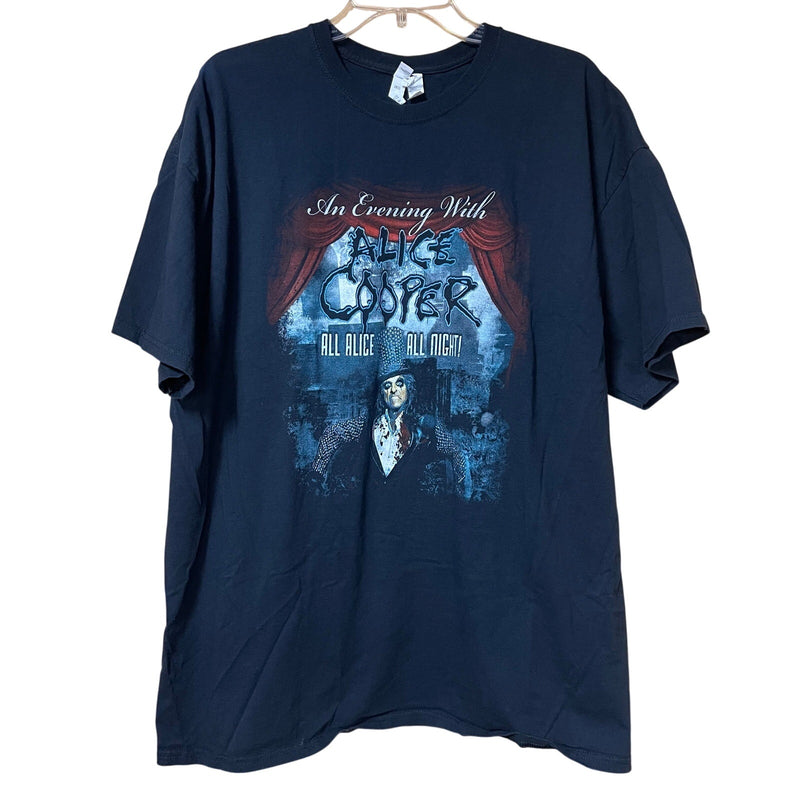 Official Alice Cooper concert tee from the “Spend the Night With Alice Cooper” 2017 Tour. Features a dark, theatrical front graphic with “An Evening With Alice Cooper – All Alice All Night!” and a bold back hit with tour dates and striking eye artwork.