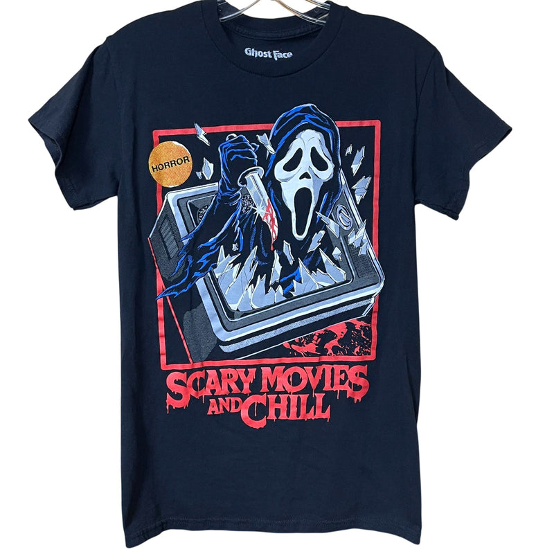 Shop NowGhostface Horror T-Shirt “Scary Movies and Chill” | Black Cotton Tee | Small