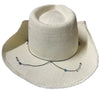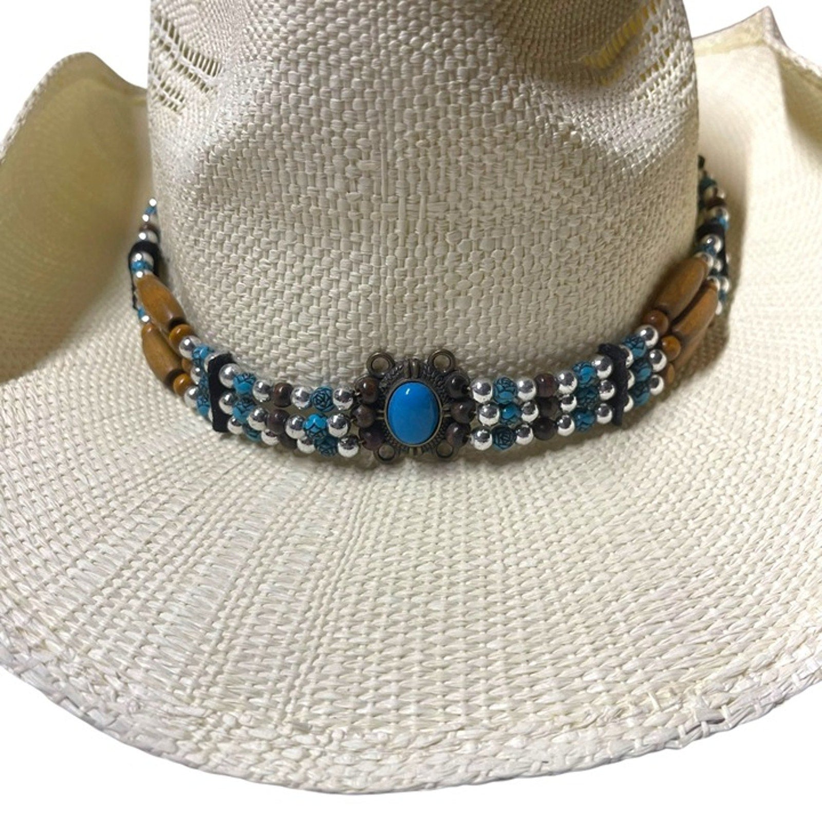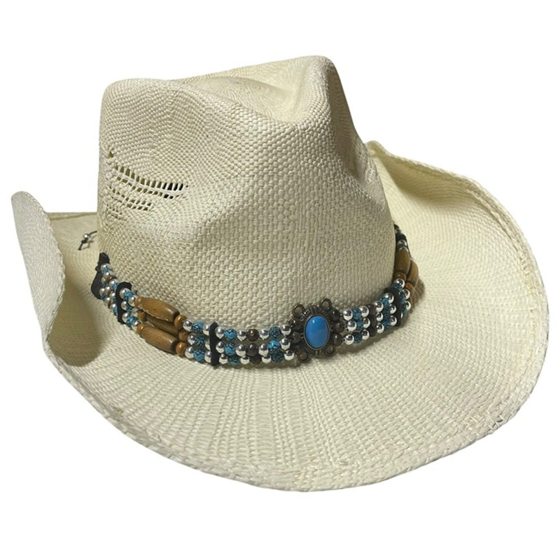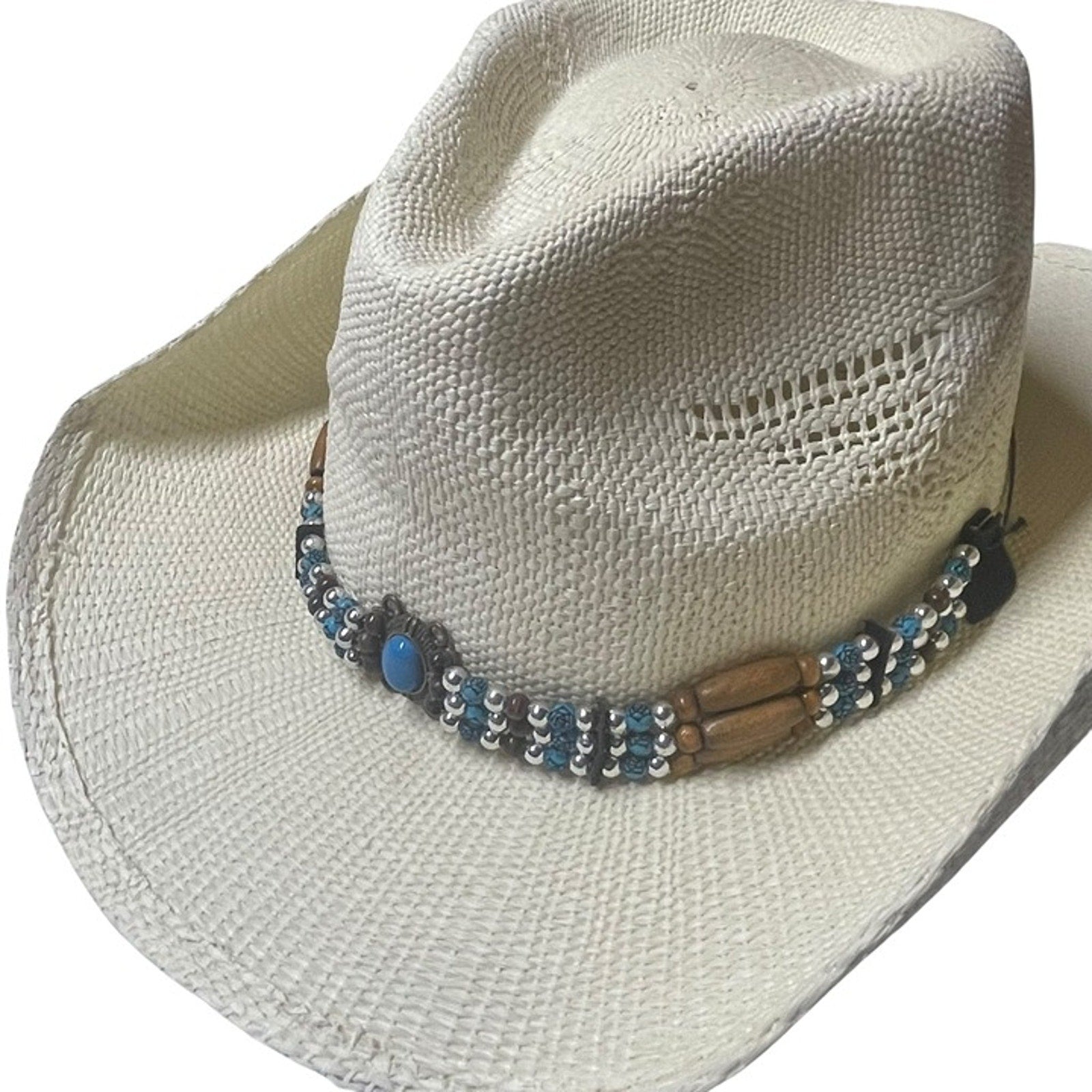Lightweight 100% straw cowboy hat with a turquoise & silver beaded hatband. Ventilated crown, wide brim, and one size fits most. Great for rodeos, concerts, or everyday western wear!