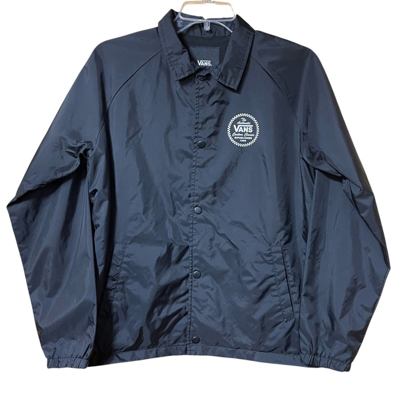 Classic black Vans coach jacket featuring the “The Authentic Vans – Custom Classic – Established 1966” chest logo. A timeless snap-front windbreaker with a clean skate / streetwear look that layers easily year-round.