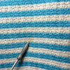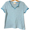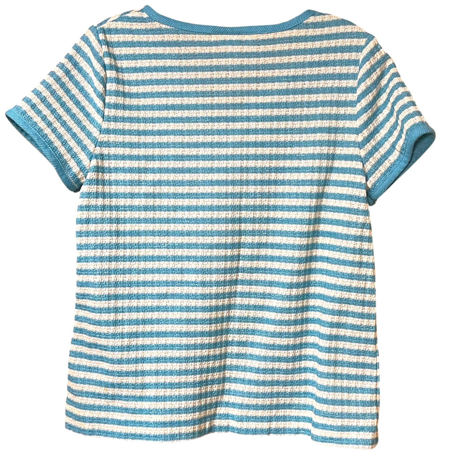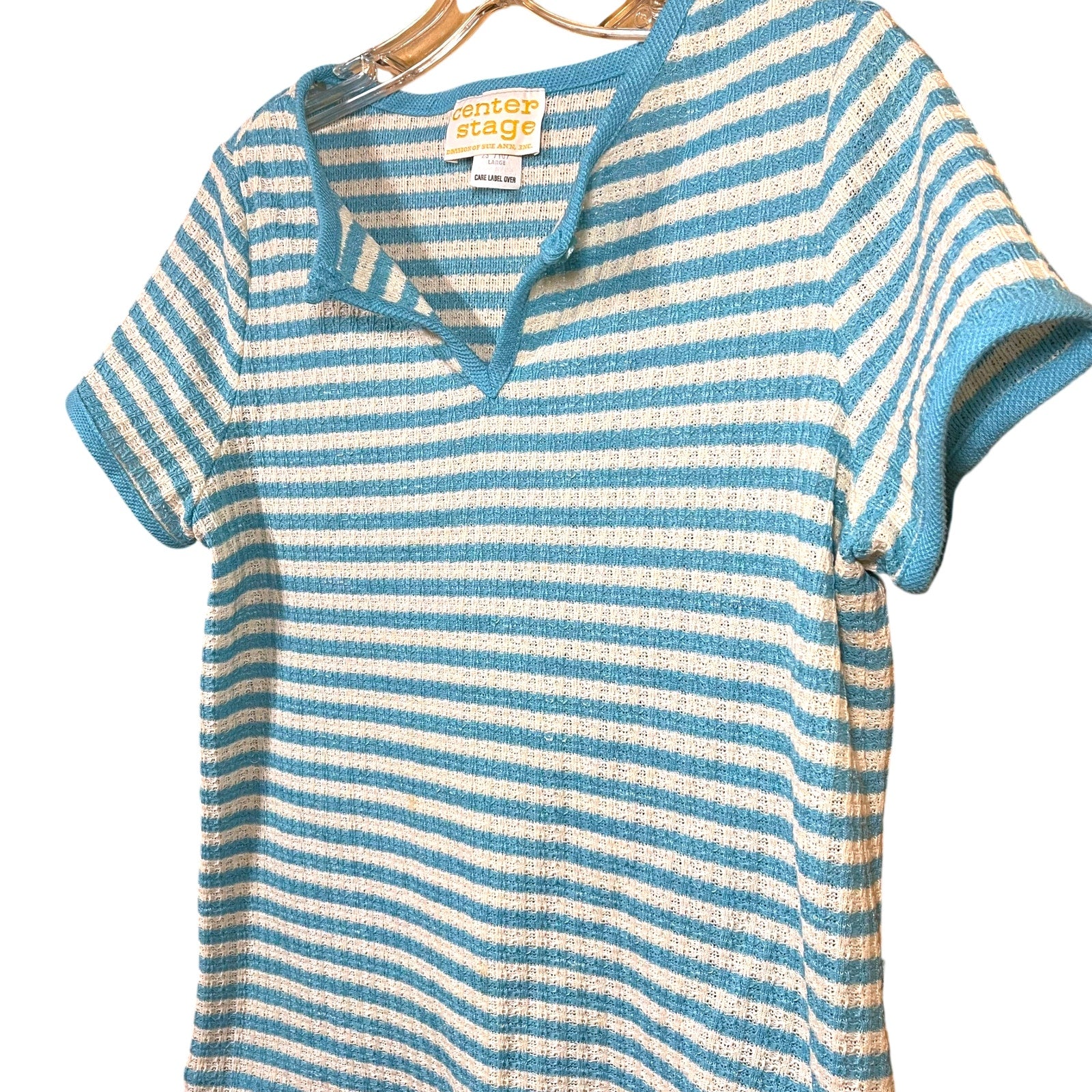 Vintage Center Stage short sleeve knit top featuring classic blue and white horizontal stripes with a textured, airy knit. Made from 100% polyester, this top is lightweight, breathable, and perfect for warm-weather layering.