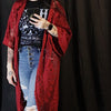 Lace kimono with embroidered design with sleeves. Dark red / burgundy color.