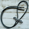 Shop NowIYKYK. Total length of tie is 36”. Adjustable metal slide with large tattoo inspired resin accent with weighted metal beads on each end. Genuine black leather braided cord. Brand new.
