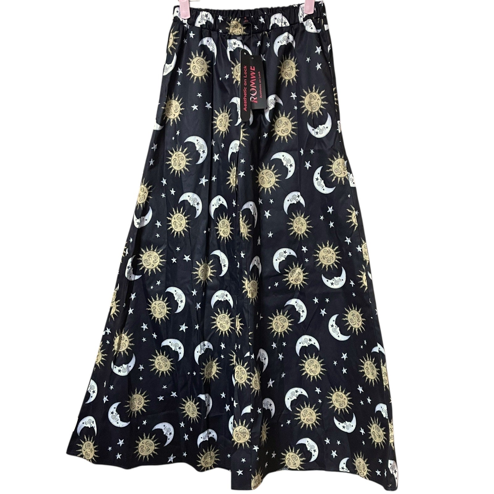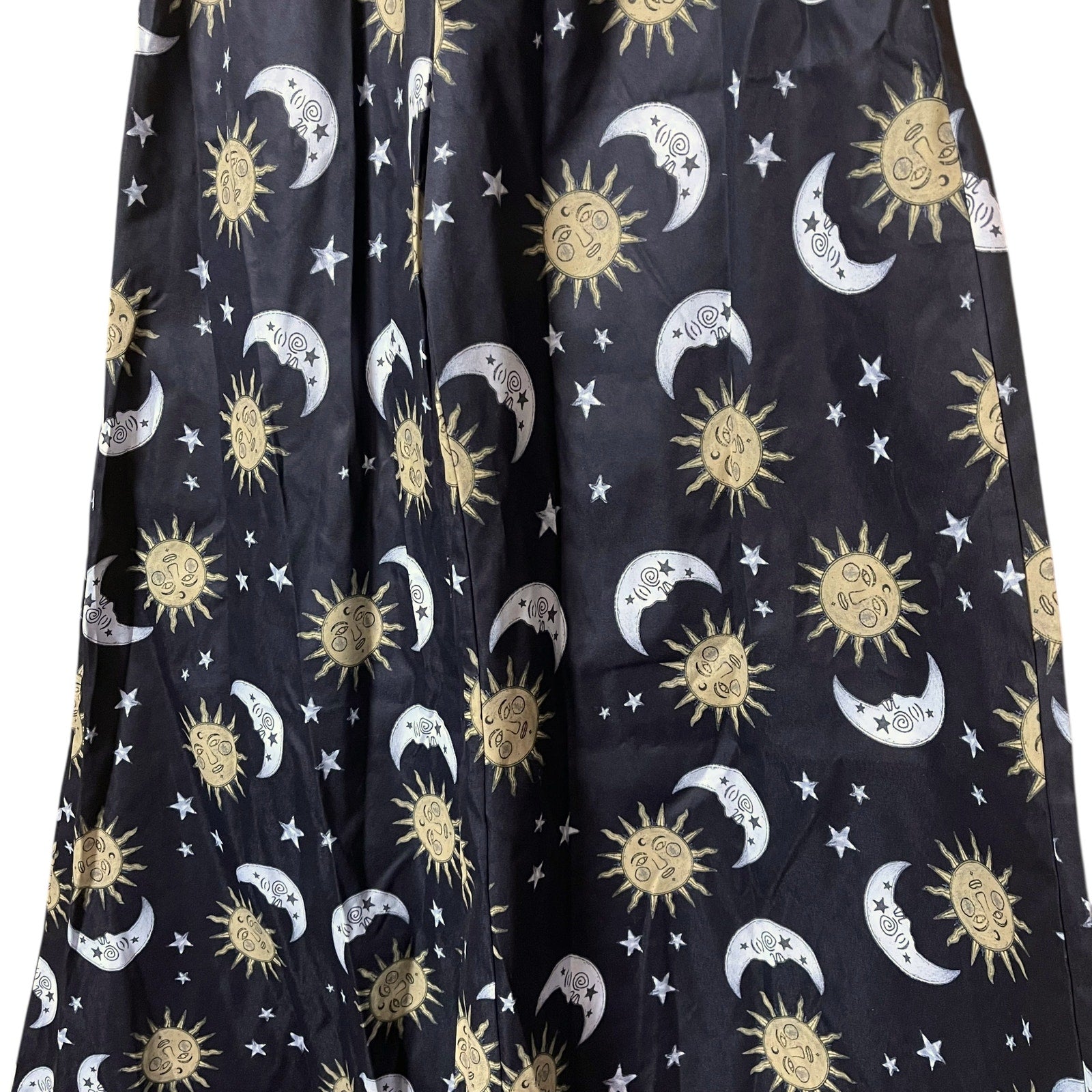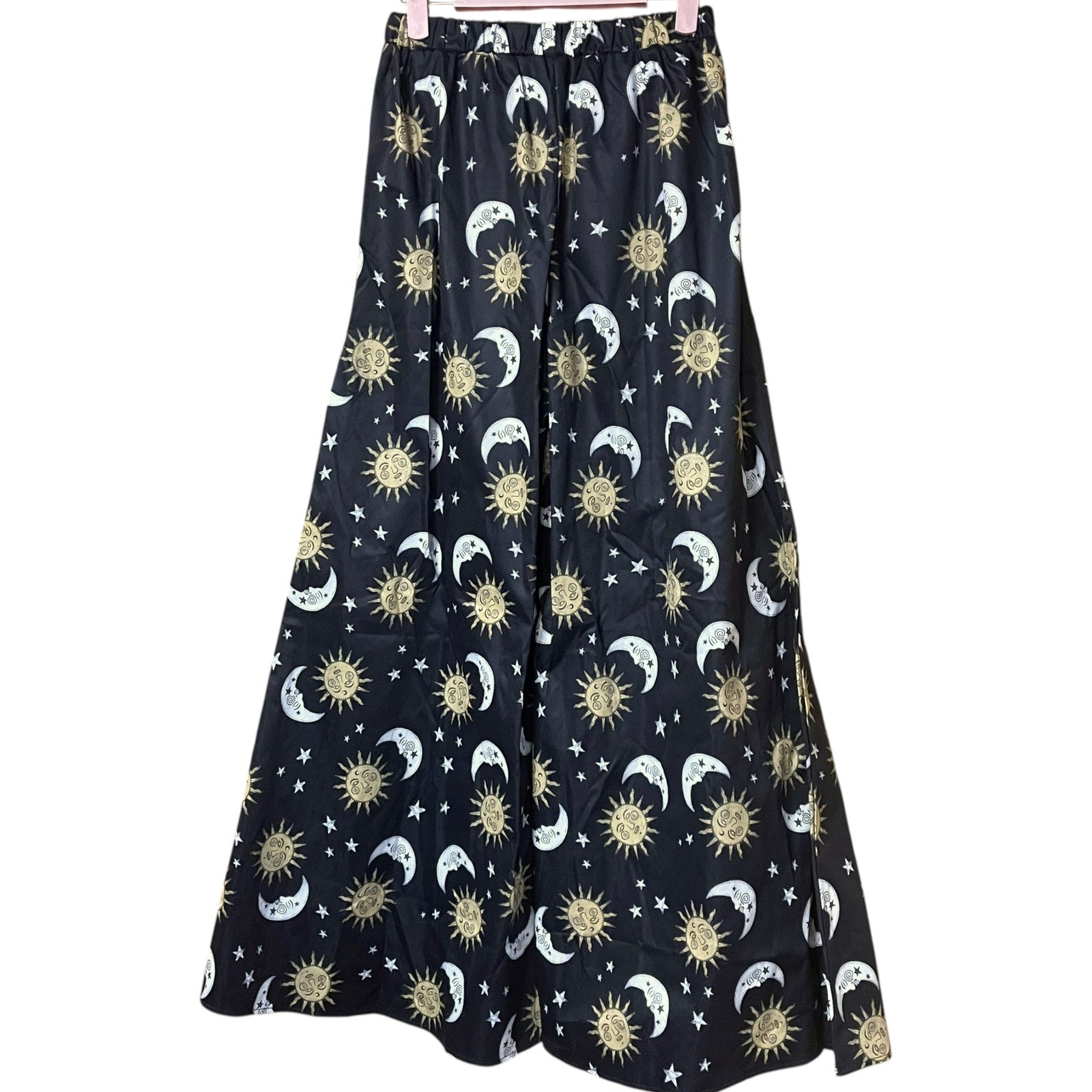 Celestial Sun & Moon Wide Leg Bell Pants – Black Astrology Print, Elastic Waist
